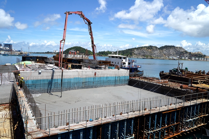 ▲東區(qū)化工碼頭項(xiàng)目胸墻澆筑作業(yè) 集團(tuán)當(dāng)前在建的10萬(wàn)噸級(jí)成品油碼頭、東區(qū)化工碼頭等碼頭泊位建設(shè)進(jìn)入沖刺階段,認(rèn)真貫徹市委市政府關(guān)于加快口岸開(kāi)放工作的要求,計(jì)劃今年竣工驗(yàn)收;茂名港務(wù)中心已完成主體結(jié)構(gòu)施工,計(jì)劃今年建成投用,將為濱海新區(qū)樹(shù)立嶄新地標(biāo);30萬(wàn)噸級(jí)原油碼頭報(bào)批報(bào)建工作取得重大突破,項(xiàng)目岸線申請(qǐng)獲得國(guó)家交通運(yùn)輸部批復(fù),前期工作不斷加快推進(jìn),即將進(jìn)入實(shí)質(zhì)性實(shí)施階段,現(xiàn)代化深水大港的畫(huà)卷徐徐展開(kāi)。 挖潛增效,劃轉(zhuǎn)老國(guó)企扭虧為盈,實(shí)現(xiàn)國(guó)有資產(chǎn)保值增值。