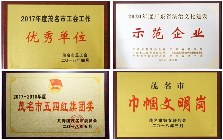 ▲集團(tuán)榮譽(yù)獎(jiǎng)牌(摘選) 幾年來(lái),集團(tuán)工會(huì)榮獲“茂名市工會(huì)工作優(yōu)秀單位”稱號(hào),集團(tuán)財(cái)務(wù)部女職工榮獲“茂名市巾幗文明崗”稱號(hào);集團(tuán)團(tuán)委成立青年志愿者服務(wù)隊(duì),助力雙創(chuàng)工作,連續(xù)三年榮獲“茂名市五四紅旗團(tuán)委”稱號(hào)。集團(tuán)憑借系列企業(yè)文化建設(shè)成果,先后榮獲 “中國(guó)企業(yè)文化建設(shè)典范企業(yè)”“廣東省先進(jìn)集體”“廣東省優(yōu)秀企業(yè)”“廣東省企業(yè)文化建設(shè)最佳實(shí)踐單位”“廣東省法治文化建設(shè)示范企業(yè)”等榮譽(yù),被譽(yù)為茂名市屬國(guó)有企業(yè)的標(biāo)桿與典范。 結(jié)語(yǔ) 十年積跬步,足下至千里;仨甑姆欠舱鞒蹋廴耸钢酒D苦奮斗,勇于擔(dān)當(dāng)作為,爭(zhēng)當(dāng)茂名向海而興排頭兵,在茂名經(jīng)濟(jì)發(fā)展史上留下堅(jiān)實(shí)的足印。