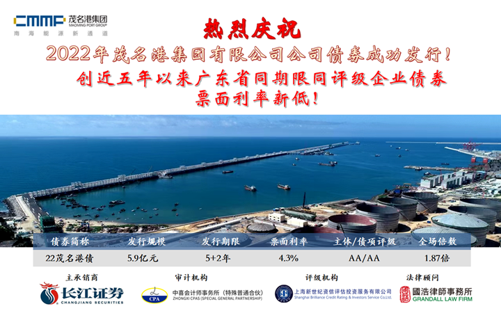 9月15日,2022年茂名港集團(tuán)有限公司公司債券成功發(fā)行,發(fā)行規(guī)模5.9億元,期限為5+2年,票面年利率4.3%,全場認(rèn)購倍數(shù)為1.87倍。本期債券創(chuàng)下票面利率新突破:創(chuàng)近五年以來全國同期限同評(píng)級(jí)企業(yè)債券第三低、廣東省同期限同評(píng)級(jí)企業(yè)債券票面利率新低! 在兩小時(shí)的簿記中,茂名港集團(tuán)公司債券得到多家金融機(jī)構(gòu)爭先認(rèn)購,使得本期公司債券利率一路走低,由4.8%降至4.3%,最終簿記當(dāng)天參與投標(biāo)的投資機(jī)構(gòu)超過20家,投標(biāo)認(rèn)購資金高達(dá)11.06億元。其中,14家投資機(jī)構(gòu)中標(biāo),發(fā)行票面利率為4.3%,為集團(tuán)節(jié)省了2095.32萬元財(cái)務(wù)成本。