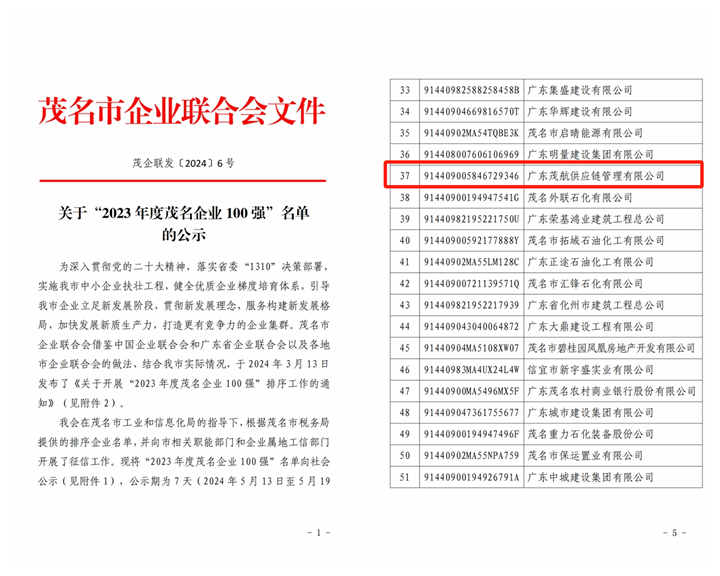 近日,茂名市企業(yè)聯(lián)合會公布了“2023年度茂名企業(yè)100強”名單,茂名港集團下屬全資子公司廣東茂航供應(yīng)鏈管理有限公司榮登排行榜第37名,成功跨入2023年茂名百強企業(yè)行列。
