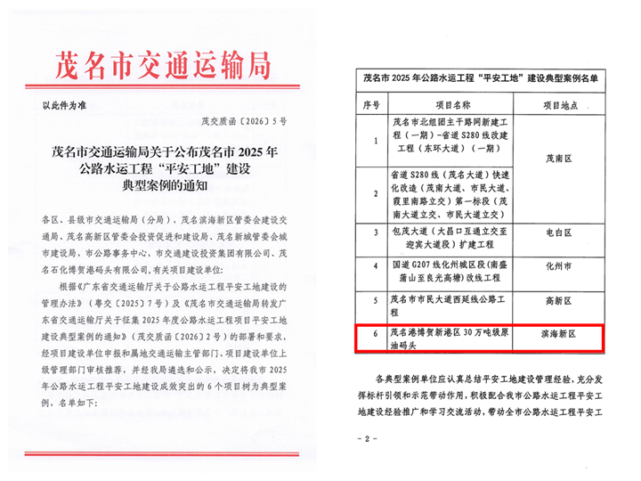 近日,茂名市交通運輸局公布2025年全市公路水運工程“平安工地”建設(shè)典型項目表彰名單,茂名港博賀新港區(qū)30萬噸級原油碼頭項目(以下簡稱“項目”)榮列其中。自2023年以來,項目已連續(xù)三年榮獲此項稱號,以三年如一日的深耕與篤行,筑牢水運工程安全防線,以標(biāo)桿之姿詮釋“平安筑港”的責(zé)任擔(dān)當(dāng),成為茂名市公路水運工程安全管理領(lǐng)域的示范樣板。